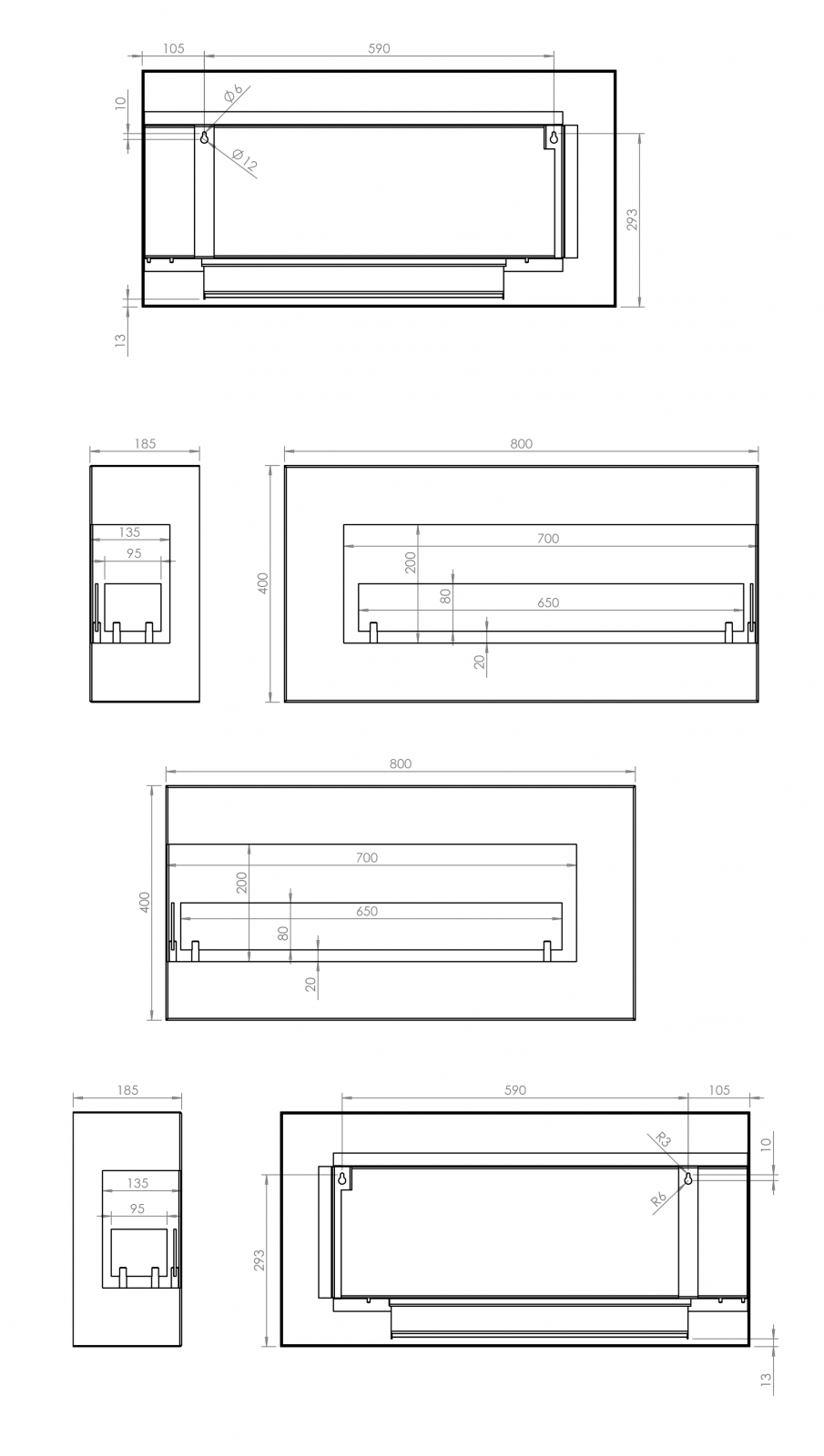 Těleso biokrbu je vyrobeno z kotlového plechu P265 pokrytého vysokoteplotní krbovou barvou, která odolává teplotám až 600 °C. Ve spodní a horní stěně tělesa krbu jsou otvory, které zajišťují cirkulaci chladného vzduchu podél jeho zadní stěny. Biokrb BLUES je standardně vybaven prosklením z oboustranně leštěného krbového skla tloušťky 4 mm, které odolává teplotám až 800 °C. Sklo zvyšuje estetiku samotného zařízení a chrání jeho topeniště. Montáž a demontáž zasklení je intuitivní a nevyžaduje od uživatele použití dalších nástrojů.