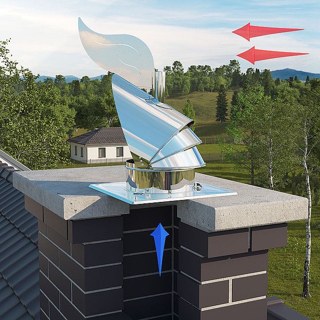 Komínová hlavice Dragon dynamicky využívá sílu větru k navýšení komínového tahu. Zabraňuje zpětnému tahu spalin a chrání komín před povětrnostními vlivy. "čepice" se otáčí ve směru větru.