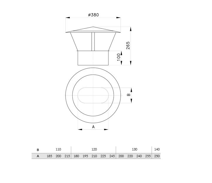 Komínová nerezová stříška oválná, rozměr 120x225mm (= ø 180mm)