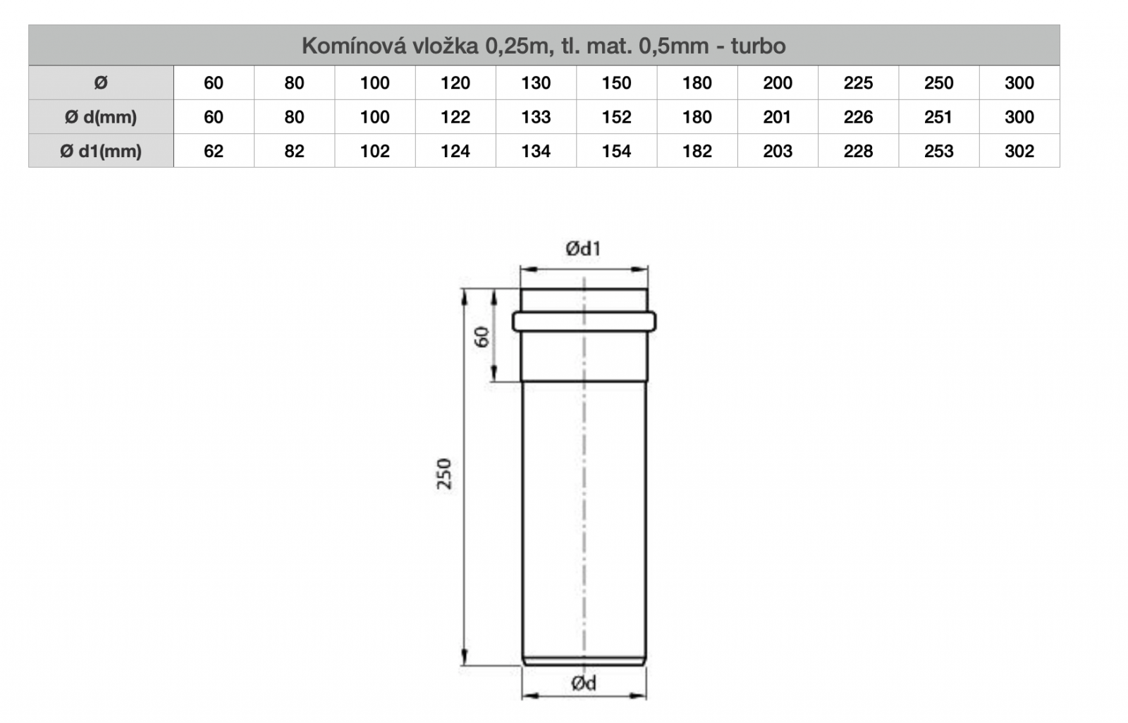 Komínová vložka 0,25m, ø 60mm, tl. mat. 0,5mm - turbo