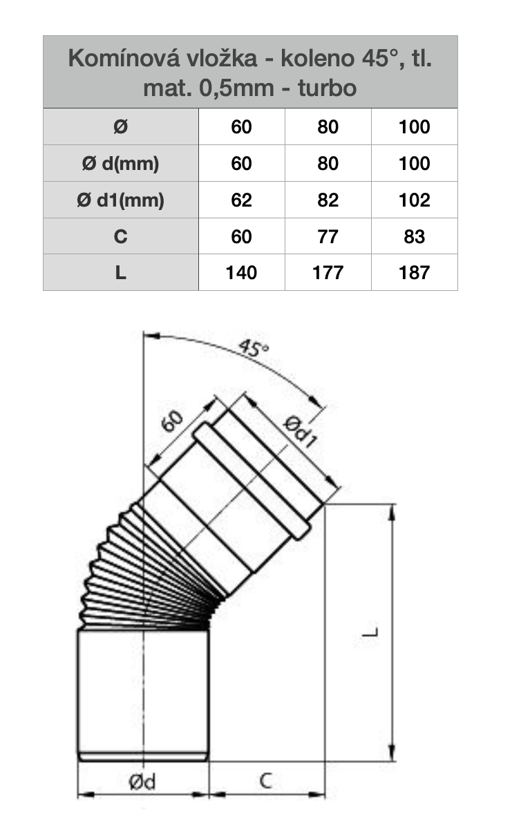 Komínová vložka - koleno 45° - ø 60mm, tl. mat. 0,5mm - turbo