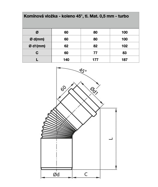 Komínová vložka - koleno 45° - ø 60mm, tl. mat. 0,5mm - turbo
