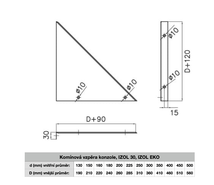 v kombinaci s deskou podpěrné konzole nebo s odlehčující konzolí slouží k vynesení váhy komínu na stěnu. Tyto vzpěry umožňují odsazení pláště komínu 70 - 150 mm od stěny.