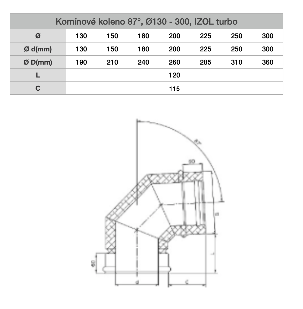 Komínové koleno 87°, ø 130mm, IZOL turbo