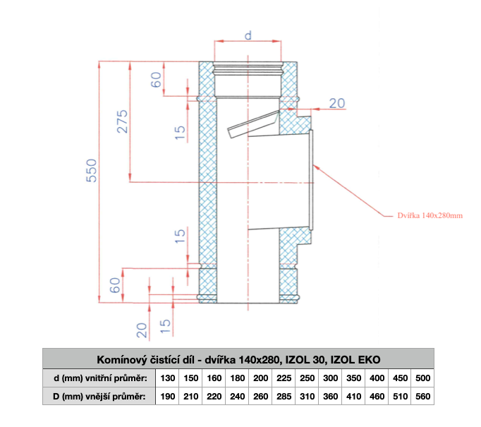 slouží ke kontrole spalinové cesty a jako vybírací otvor pro případné nečistoty usazené v komínu. Čistící díl je opatřen dvířky s rozměrem 140x280 mm. Součástí těchto dvířek je klíč pro snadné otevírání.