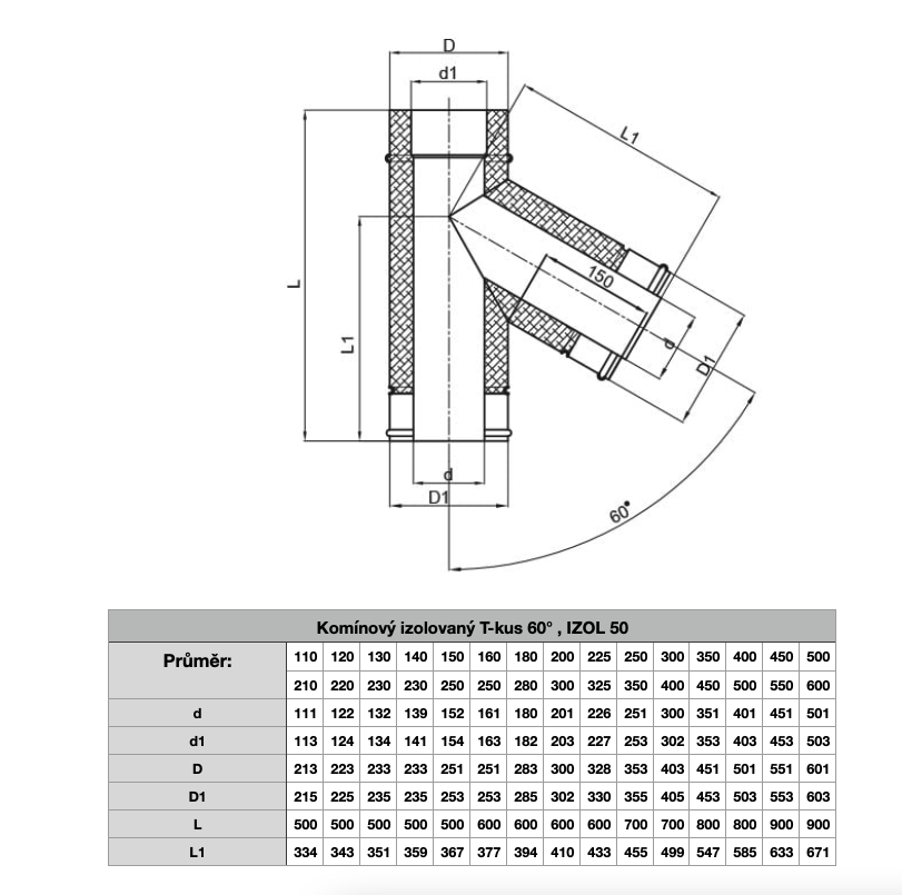 Komínový izolovaný T-kus 60° ø 250/350 mm, systém IZOL 50
