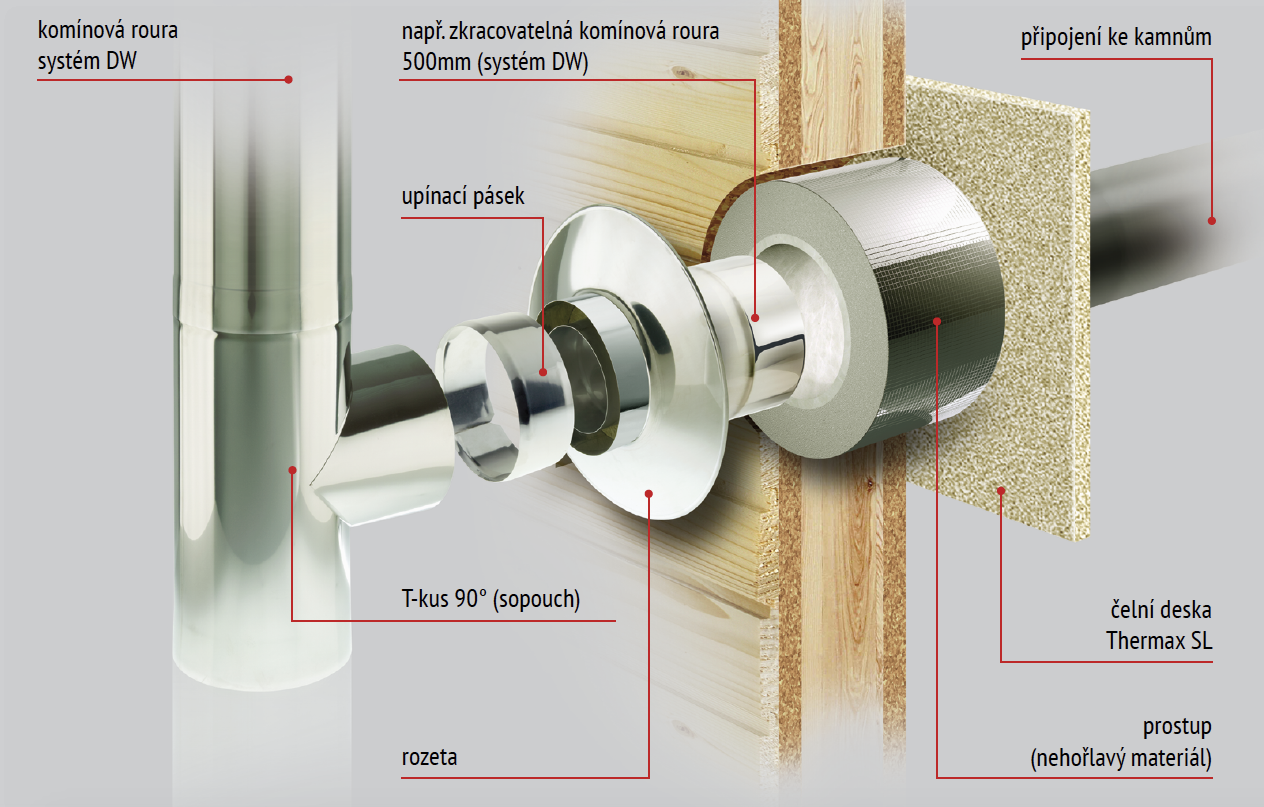 Stěnové, stropní a střešní prostupy pasují všude tam, kde je třívrstvý komín veden přes komponenty z hořlavých materiálů. Díky provedení s novou izolací ze skelných vláken dosáhne několikanásobně vyššího izolačního účinku než obvyklé materiály, například minerální skelná vata. Toto zvláštní složení umožní vedení vnější stranou zdi, stropem nebo střechou a nevadí styku s hořlavými materiály.