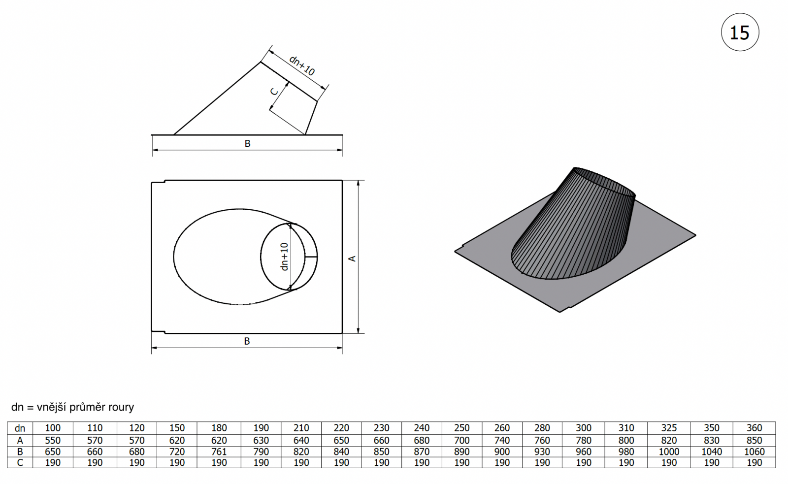 je určen k oplechování nerezového izolovaného komínu o vnějším průměru 250 mm. Tento prostup je určen pro střechy se sklonem 20-50° (neprofilované krytiny: rovný plech, asfaltový šindel, střešní fólie). Součástí střešního přechodu je protidešťová manžeta.