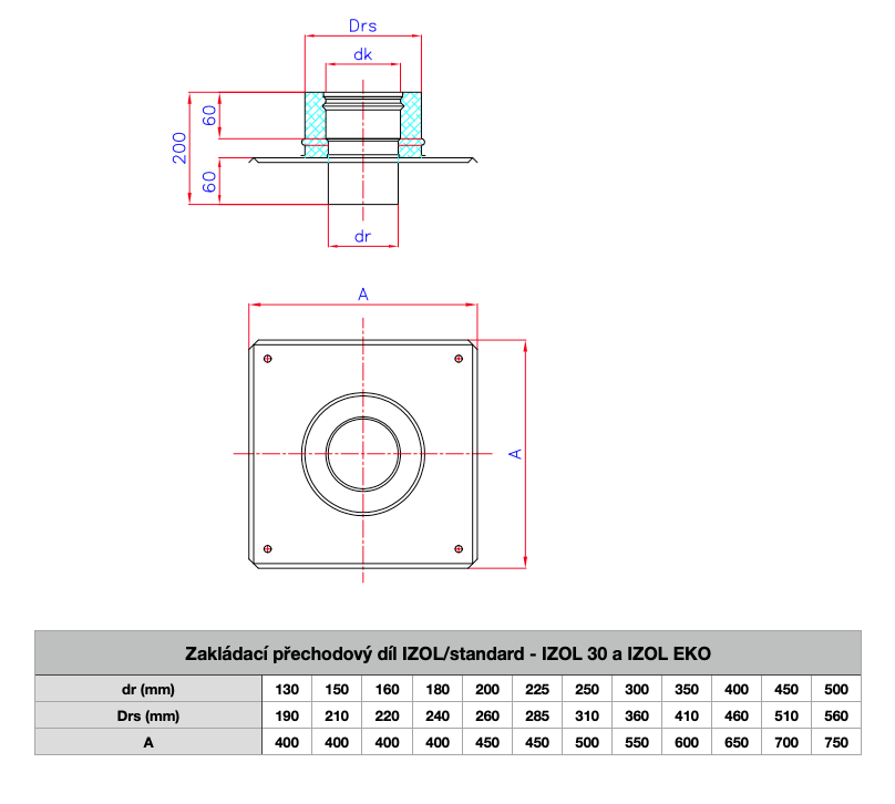 se používá k přechodu z nerezové jednovrstvé komínové vložky na nerezový izolovaný systém. Nejčastěji se používá jako zakládací díl nerezových izolovaných nástavců. Část nad deskou je tříšložková - systém IZOL 30, část pod deskou je jednovrstvá - systém STANDARD 05/08.