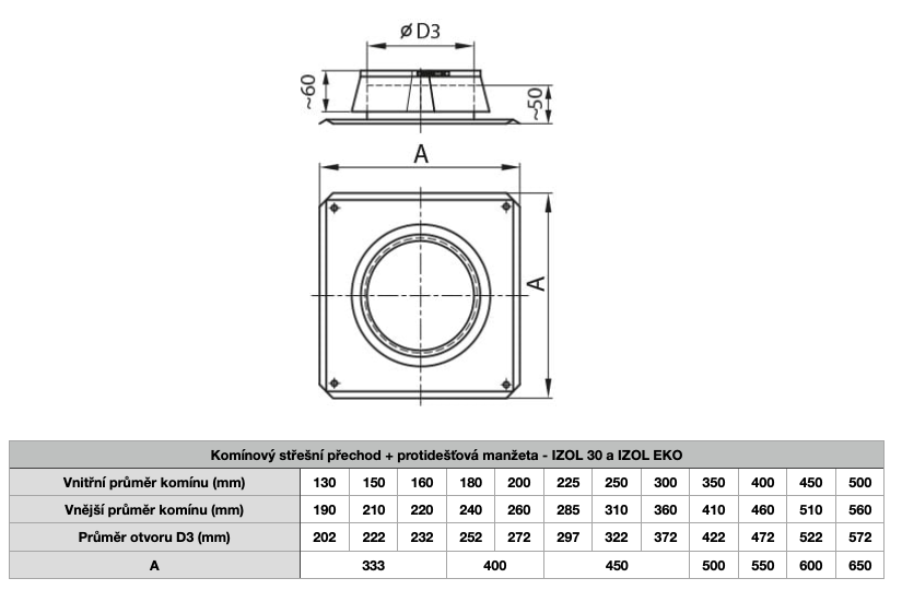 Komínový střešní přechod + protidešťová manžeta pro ø 150/210 mm, IZOL 30