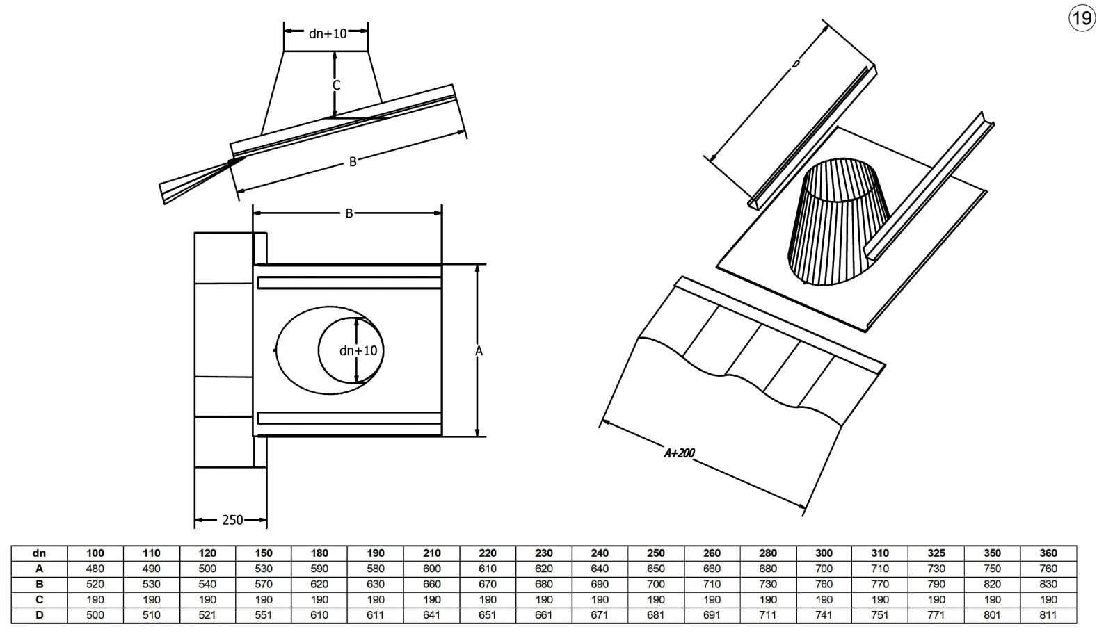 je určen k oplechování nerezového izolovaného komínu o vnějším průměru 190 mm. Chrání otvor mezi střešní krytinou a komínem a zabraňuje zatékání dešťové vody do konstrukce střechy. Součástí střešního přechodu je i protidešťová manžeta. Pomocí olověného pásu vytvarujeme profil střešní krytiny. Tento prostup je určen pro střechy se sklonem 5-30° (profilované krytiny: tašky, vlnitý plech, atd.).