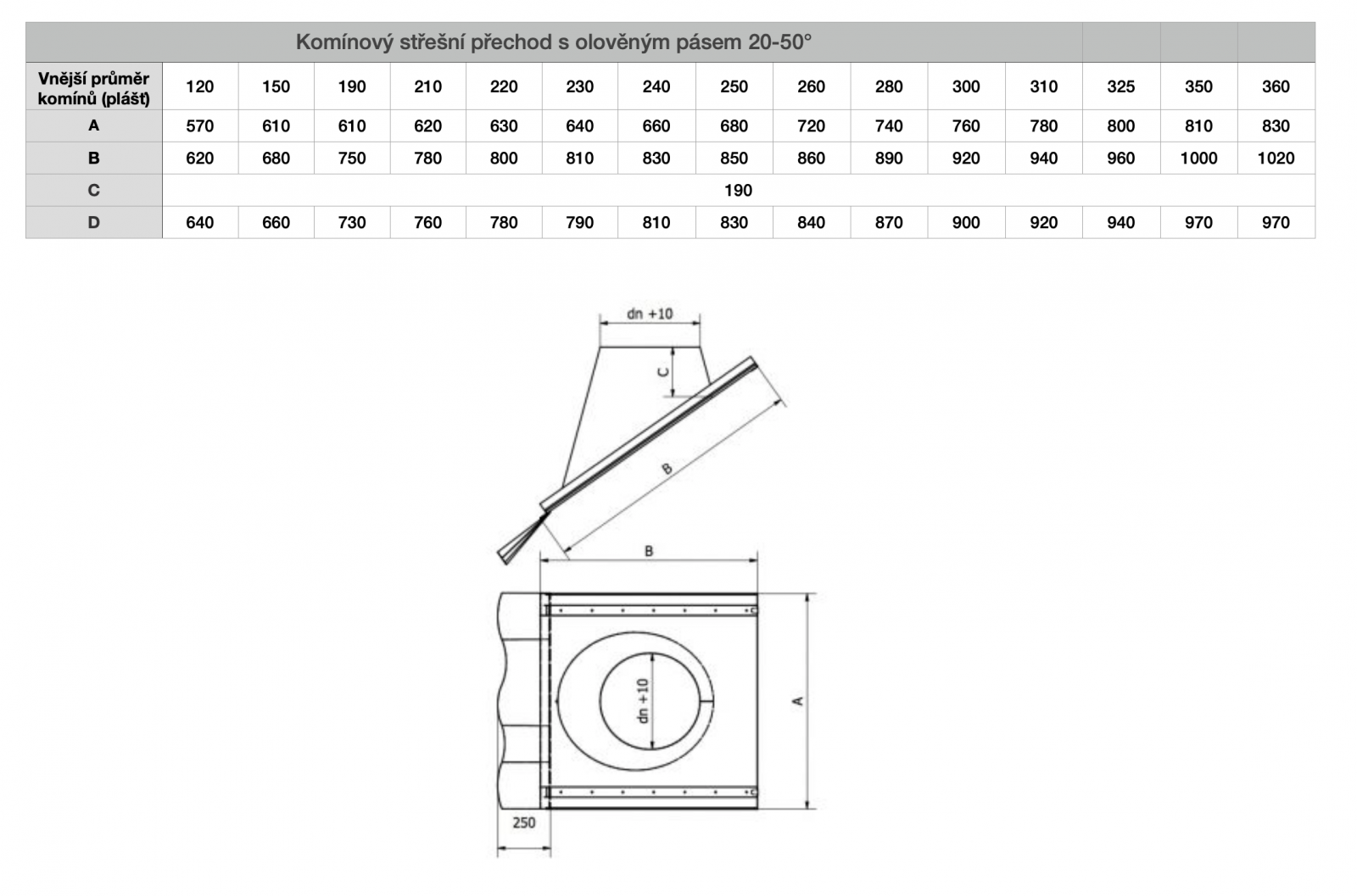 Komínový střešní přechod 20-50° s olověným pásem pro ø 200/300 mm