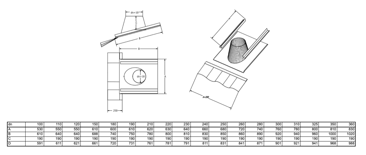 je určen k oplechování nerezového izolovaného komínu o vnějším průměru 285 mm. Chrání otvor mezi střešní krytinou a komínem a zabraňuje zatékání dešťové vody do konstrukce střechy. Součástí střešního přechodu je i protidešťová manžeta. Pomocí olověného pásu vytvarujeme profil střešní krytiny. Tento prostup je určen pro střechy se sklonem 20-50° (profilované krytiny: tašky, vlnitý plech, atd.).