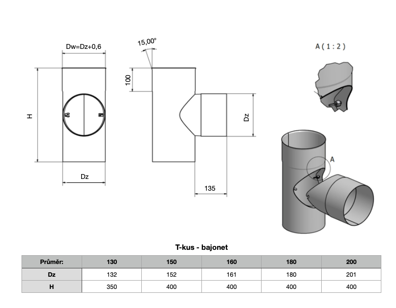 slouží jako odbočka k dopojení komínové soustavy ke kotli. Instaluje se hrdlem nahoru, kde se pokračuje příslušným počtem komínových vložek k docílení dané účinné výšky. Komínový T- kus s odnímatelným sopouchem (připevnění na bajonet) umožňuje vyvložkování bez nutnosti sekání tak velkého montážního otvoru do komínového zdiva.