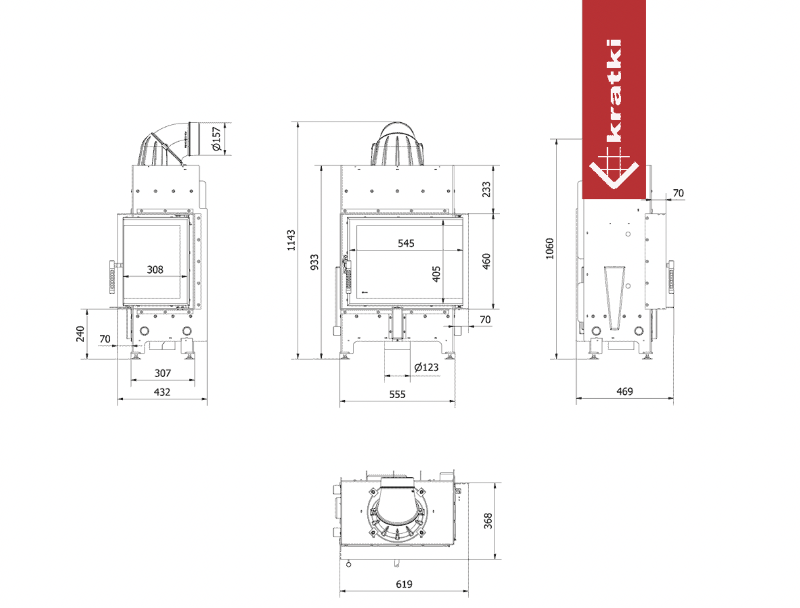 - Speciální perforovaný design madla dvířek chrání před nadměrným ohřevem, což zvyšuje komfort používání krbu.