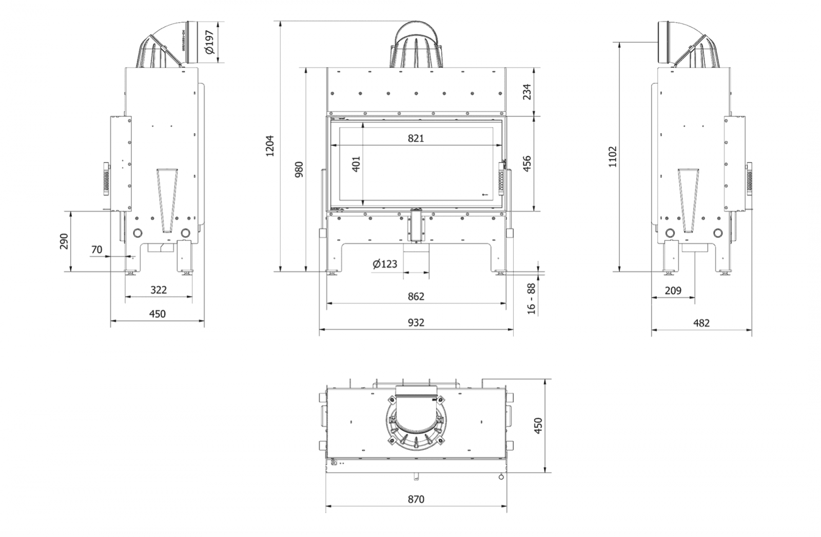 - Pokročilá konstrukce zahrnuje vestavěný přívod vzduchu ø 125mm, který zajišťuje efektivní spalování dřeva.