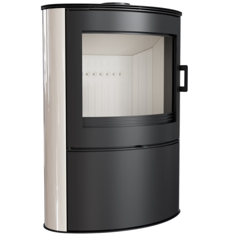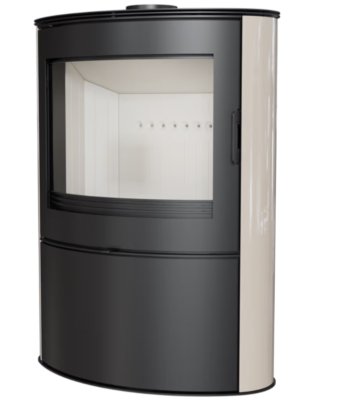 Vylepšené zakřivení skla pro větší a efektivní požitek z plmenů rozpáleného topeniště.