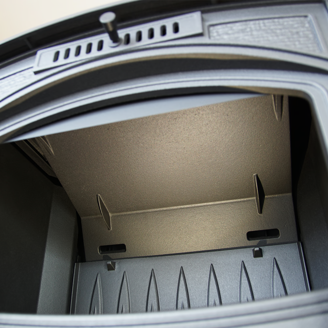 Důležitou součástí jsou také zásuvná nádoba a pohyblivý rošt, které umožňují snadné odstraňování zbylého popela.