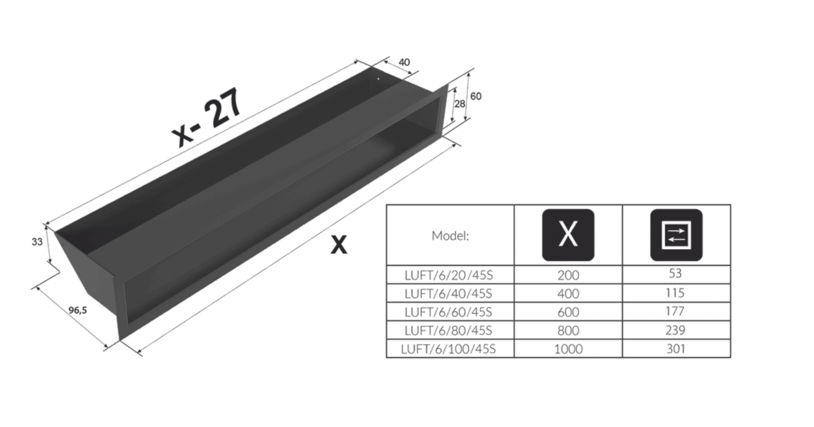Krbová mřížka LUFT je estetickým zakončením kanálů rozvádějících teplý vzduch od krbu.