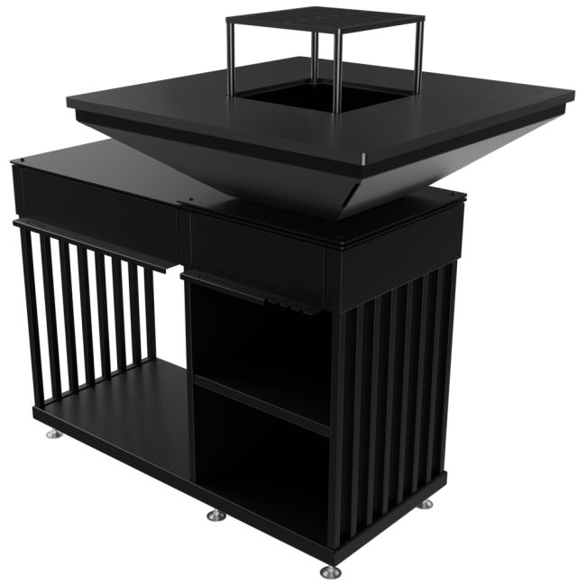 QUADRUM Horizontal je profesionální zahradní gril s ohništěm na dřevo. Spojuje vše v jednom. Je vybaven litinovým roštem, praktickými úložnými přihrádkami na náčiní a koření a praktickou / prostornou prohlubní na dřevo. QUADRUM je nejen moderní zahradní gril, ale také plně vybavená venkovní kuchyně.