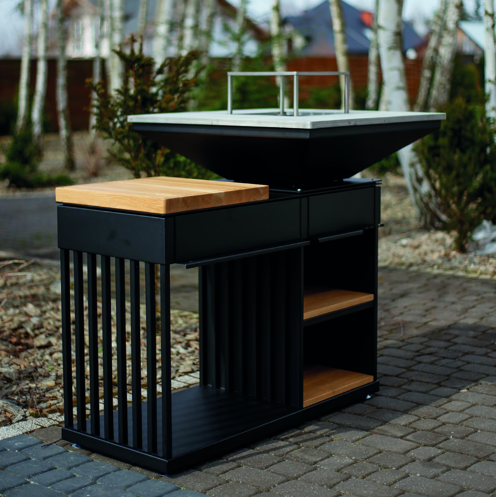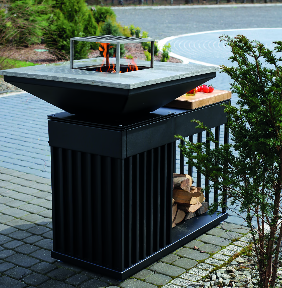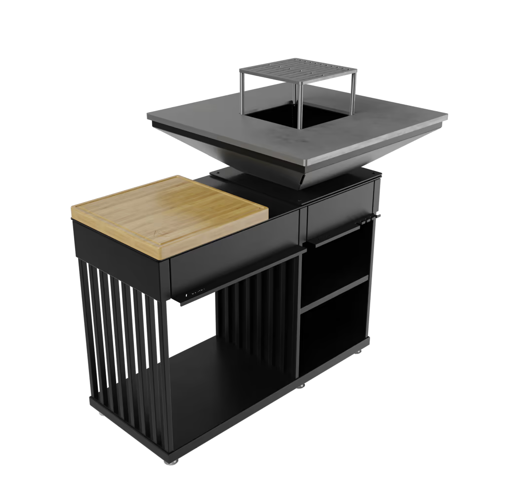 QUADRUM je profesionální zahradní gril s ohništěm na dřevo. Spojuje vše v jednom. Je vybaven litinovým roštem, prkénkem / stolní deskou, praktickými úložnými přihrádkami na náčiní a koření a praktickou / prostornou prohlubní na dřevo. QUADRUM je nejen moderní zahradní gril, ale také plně vybavená venkovní kuchyně.