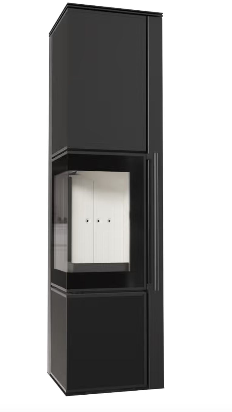 Je vybaven rohovými dvířky zdobenými černěným sklem.