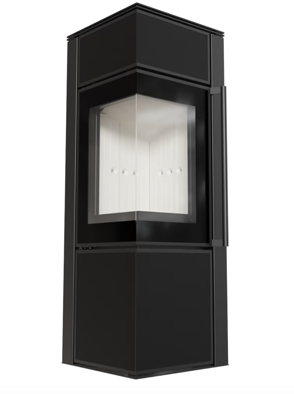 Je vybaven rohovými dvířky zdobenými černěným sklem.