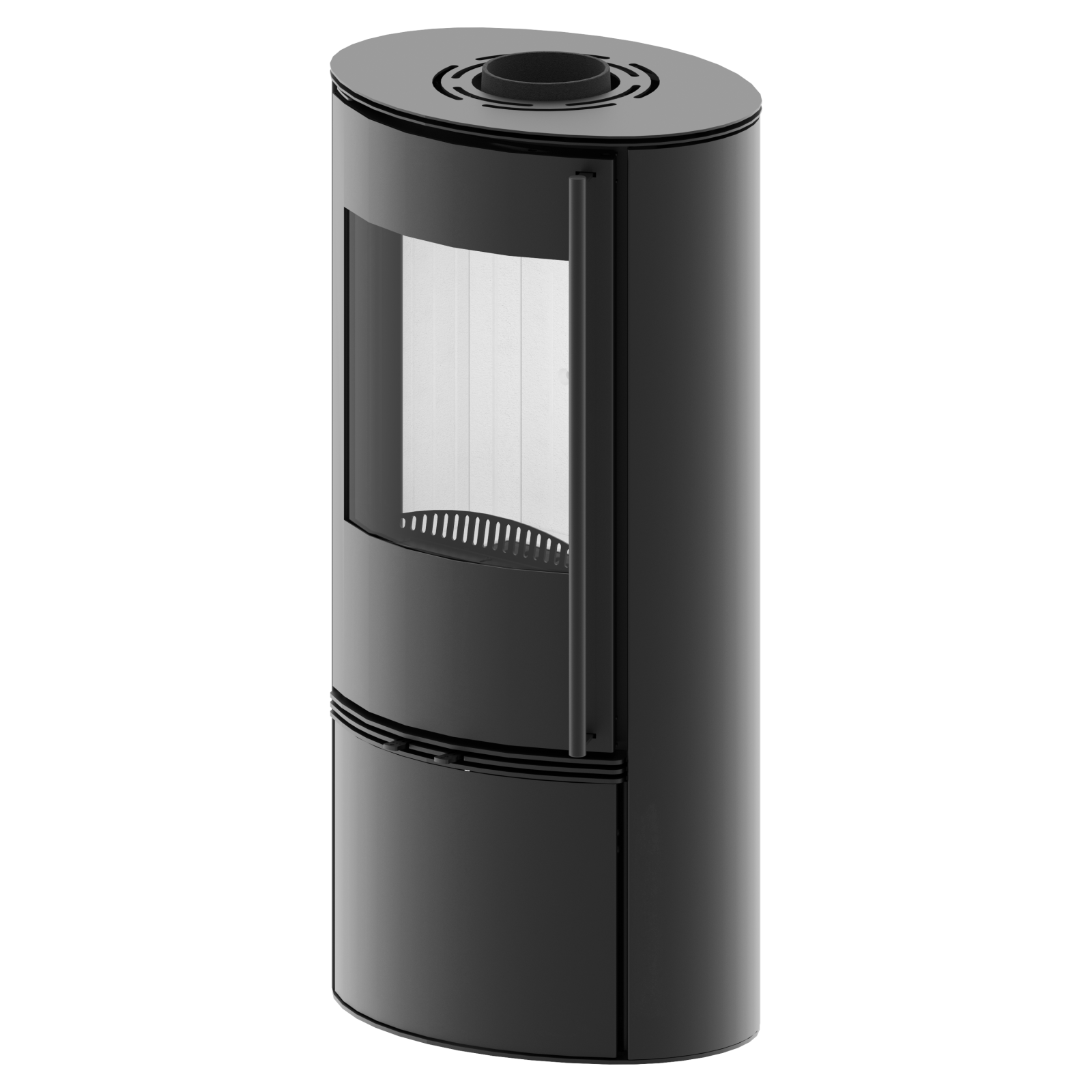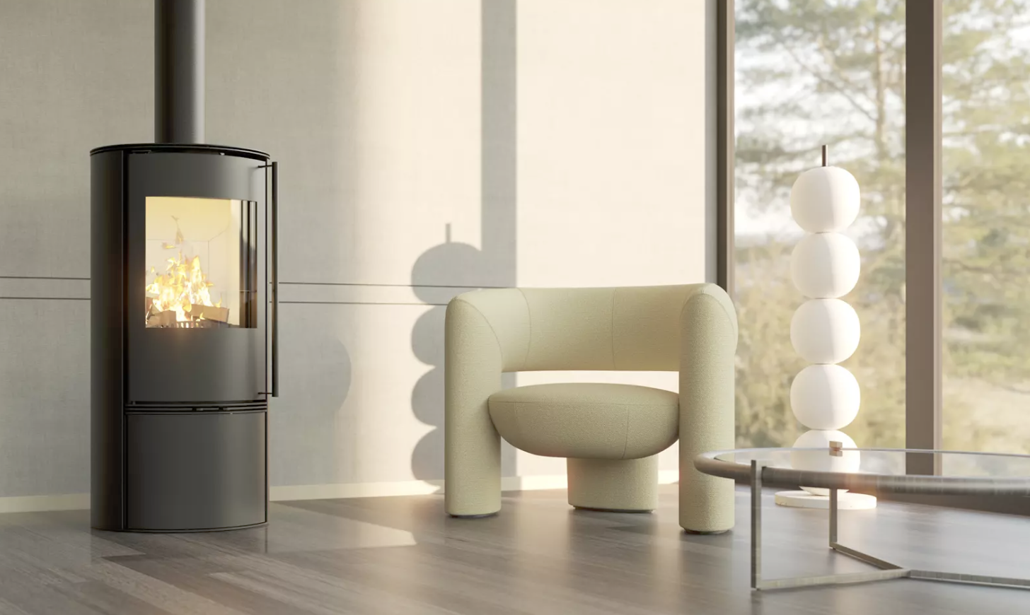 Jeho designový eliptický tvar vyčnívá z tradičních krbů a dodává interiéru jedinečný charakter.