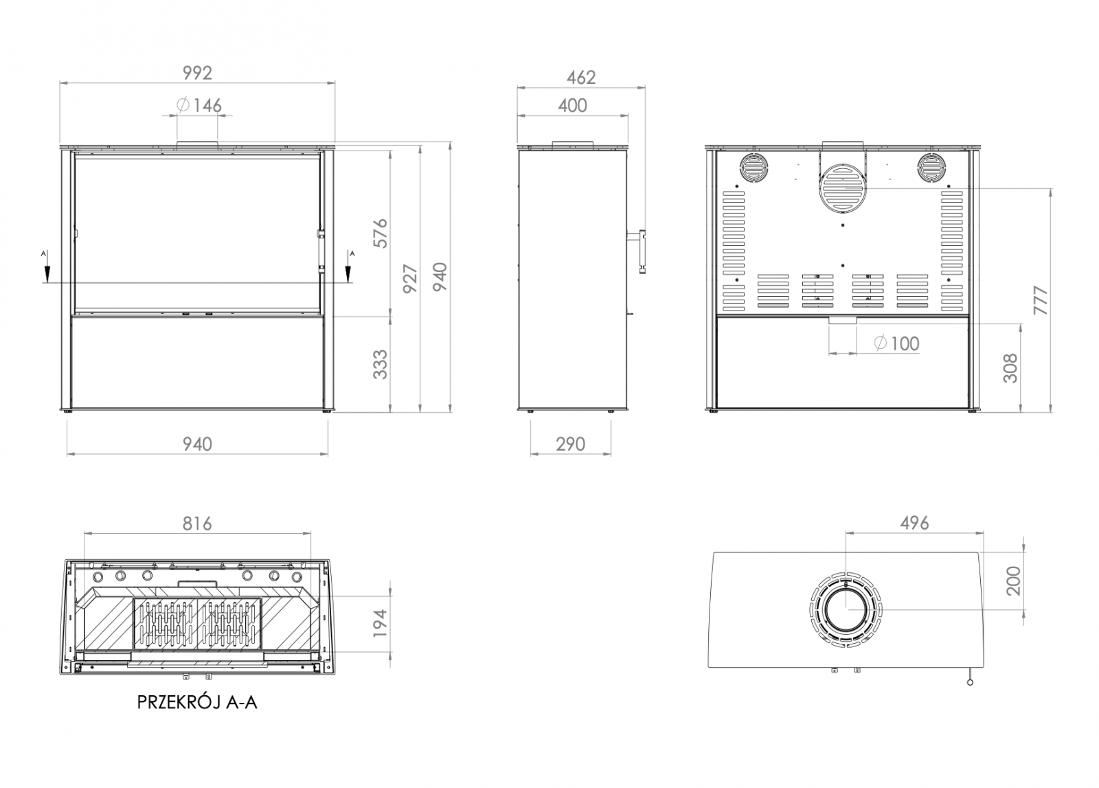 - Vývod spalin je umístěn vzadu a horní část korby lze použít jako topnou desku.