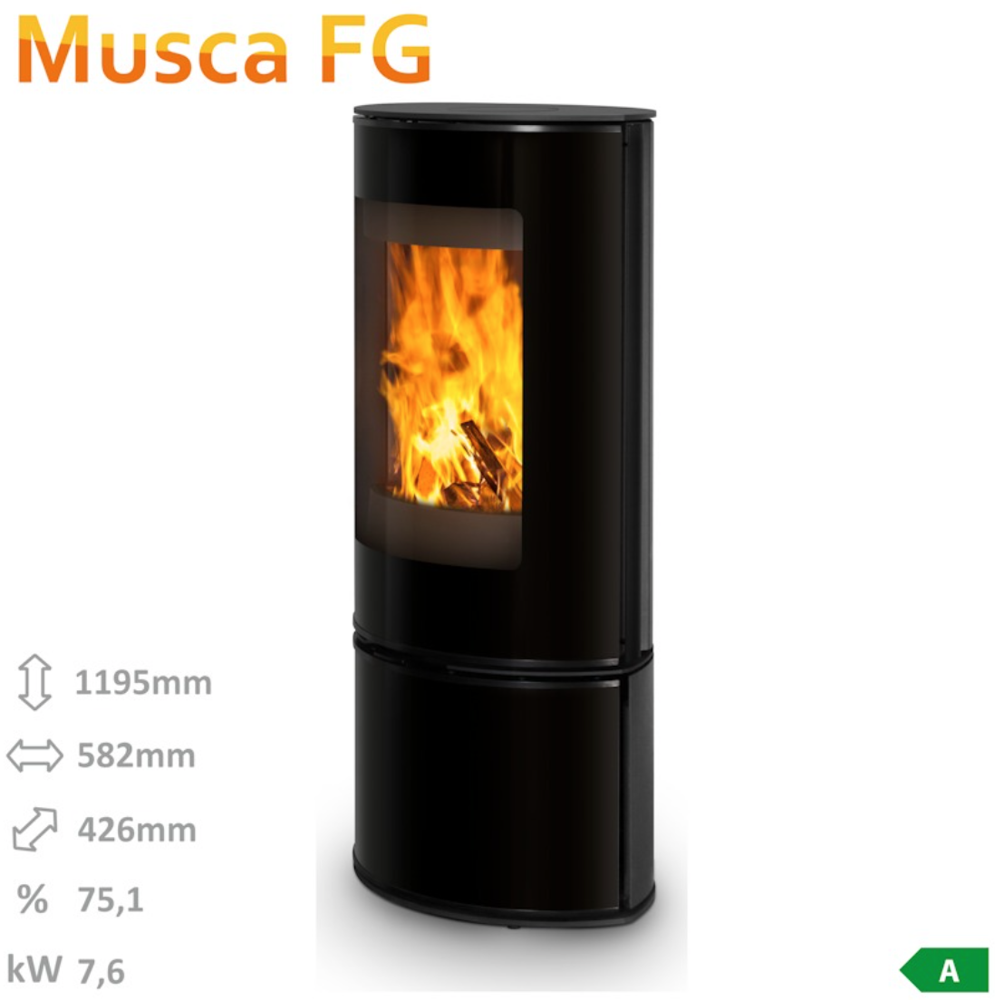 Designová a unikátní svým tvarem. Česká krbová kamna MUSCA FG dokonale padnou do prostoru, kde nezaberou ani o kousek víc místa, než je potřeba. Elegantní krbová kamna eliptického půdorysu s bohatou prosklenou čelní plochou, vhodná pro každý interiér. Kamna skvěle vyniknou i uprostřed místnosti. Krbová kamna jsou vhodná pro nízkoenergetické domy. Disponují systémem centrálního přívodu externího vzduchu. Odvětrávaná SKRYTÁ designová klika umožňuje manipulaci během topení. Výsuvný šuplík se systémem "PUSH-PULL" ohromí propracovanou funkcí. Dveře je možné aretovat v poloze otevřeno. Díky sekundárnímu přívodu vzduchu je sklo dvířek omýváno, a tak nedochází k usazování nečistot. Spalovací komora je vyložena betonovými tvarovkami. Regulaci primárního a sekundárního přívodu vzduchu lze řídit jediným ovládacím prvkem.