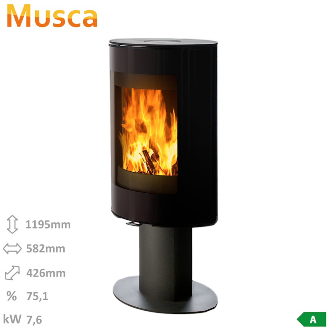 Designová a unikátní svým tvarem. Otočná česká krbová kamna MUSCA dokonale padnou do prostoru, kde nezaberou ani o kousek víc místa, než je potřeba. Elegantní krbová kamna eliptického půdorysu s bohatou prosklenou čelní plochou, vhodná pro každý interiér. Kamna skvěle vyniknou i uprostřed místnosti. Krbová kamna jsou vhodná pro nízkoenergetické domy. Disponují systémem centrálního přívodu externího vzduchu. Odvětrávaná SKRYTÁ designová klika umožňuje manipulaci během topení. Dveře je možné aretovat v poloze otevřeno. Díky sekundárnímu přívodu vzduchu je sklo dvířek omýváno, a tak nedochází k usazování nečistot. Spalovací komora je vyložena betonovými tvarovkami. Regulaci primárního a sekundárního přívodu vzduchu lze řídit jediným ovládacím prvkem.