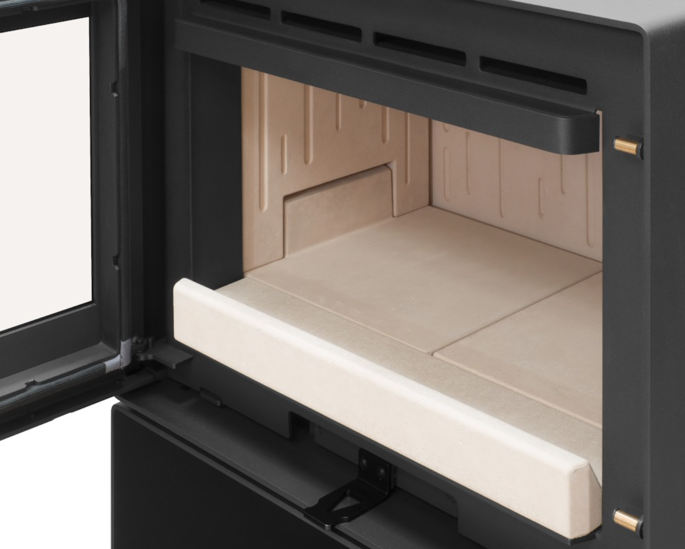 Masivní skleněná dvířka Vám zajistí bezstarostný provoz kamen Phoenix. Dohromady s betonovou komorou tvoří téměř nezničitelnou spalovací komoru.