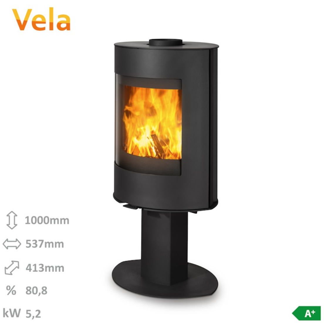 Minimalistická, ale zároveň dominantní svým tvarem. Otočná krbová kamna VELA dokonale padnou do prostoru, kde nezaberou ani o kousek víc místa, než je potřeba. Elegantní a kompaktní krbová kamna eliptického půdorysu s bohatou prosklenou čelní plochou, vhodná pro každý interiér. Kamna skvěle vyniknou i uprostřed místnosti. Krbová kamna jsou vhodná pro nízkoenergetické domy. Disponují systémem centrálního přívodu externího vzduchu. Odvětrávaná SKRYTÁ designová klika umožňuje manipulaci během topení. Dveře je možné aretovat v poloze otevřeno. Ve standardu je možné zapojení horního nebo zadního odvodu spalin. Díky sekundárnímu přívodu vzduchu je sklo dvířek omýváno, a tak nedochází k usazování nečistot. Spalovací komora je vyložena betonovými tvarovkami. Regulaci primárního a sekundárního přívodu vzduchu lze řídit jediným ovládacím prvkem.