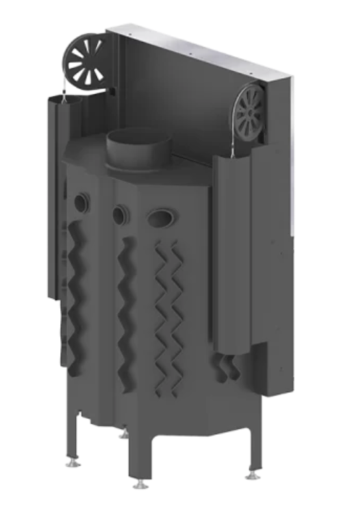 - Speciálně navržená zadní část tělesa umožňuje přívod sekundárního vzduchu do horní části pece. Umožňuje zvýšit účinnost zařízení spalováním výfukových plynů.