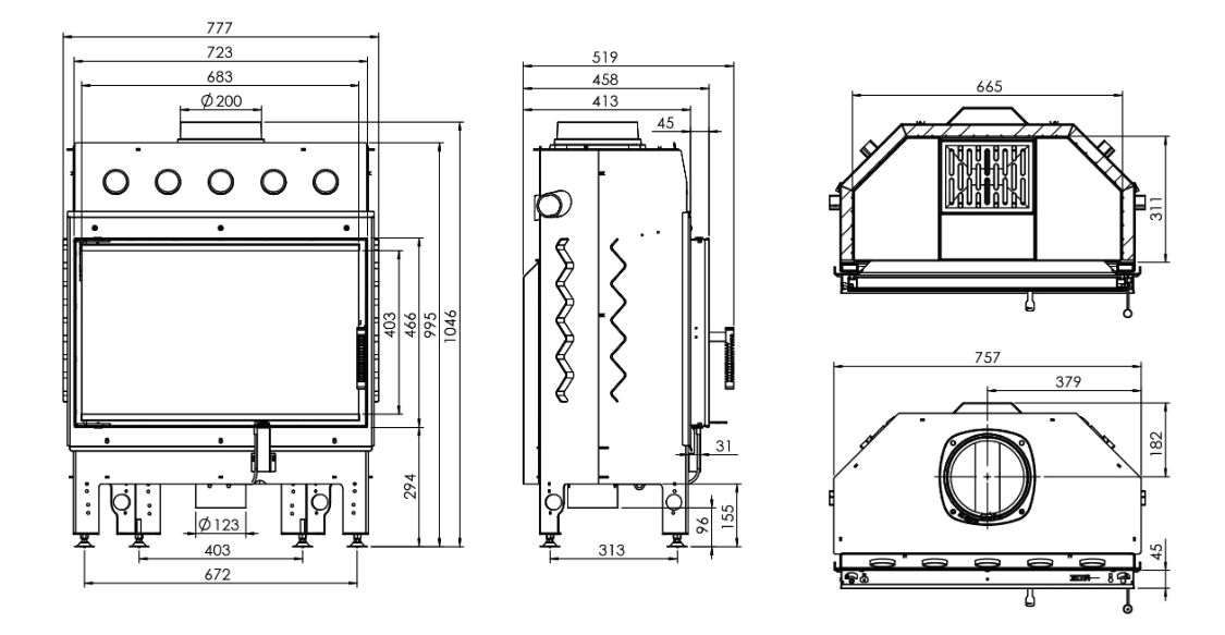 - Speciálně navržená zadní část tělesa umožňuje přívod sekundárního vzduchu do horní části pece. Umožňuje zvýšit účinnost zařízení spalováním výfukových plynů.