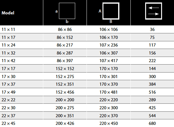 11x11, 11x17, 11x24, 11x32, 11x42, 17x17, 17x30, 17x37, 17x49, 22x22, 22x30, 22x37x 22x45