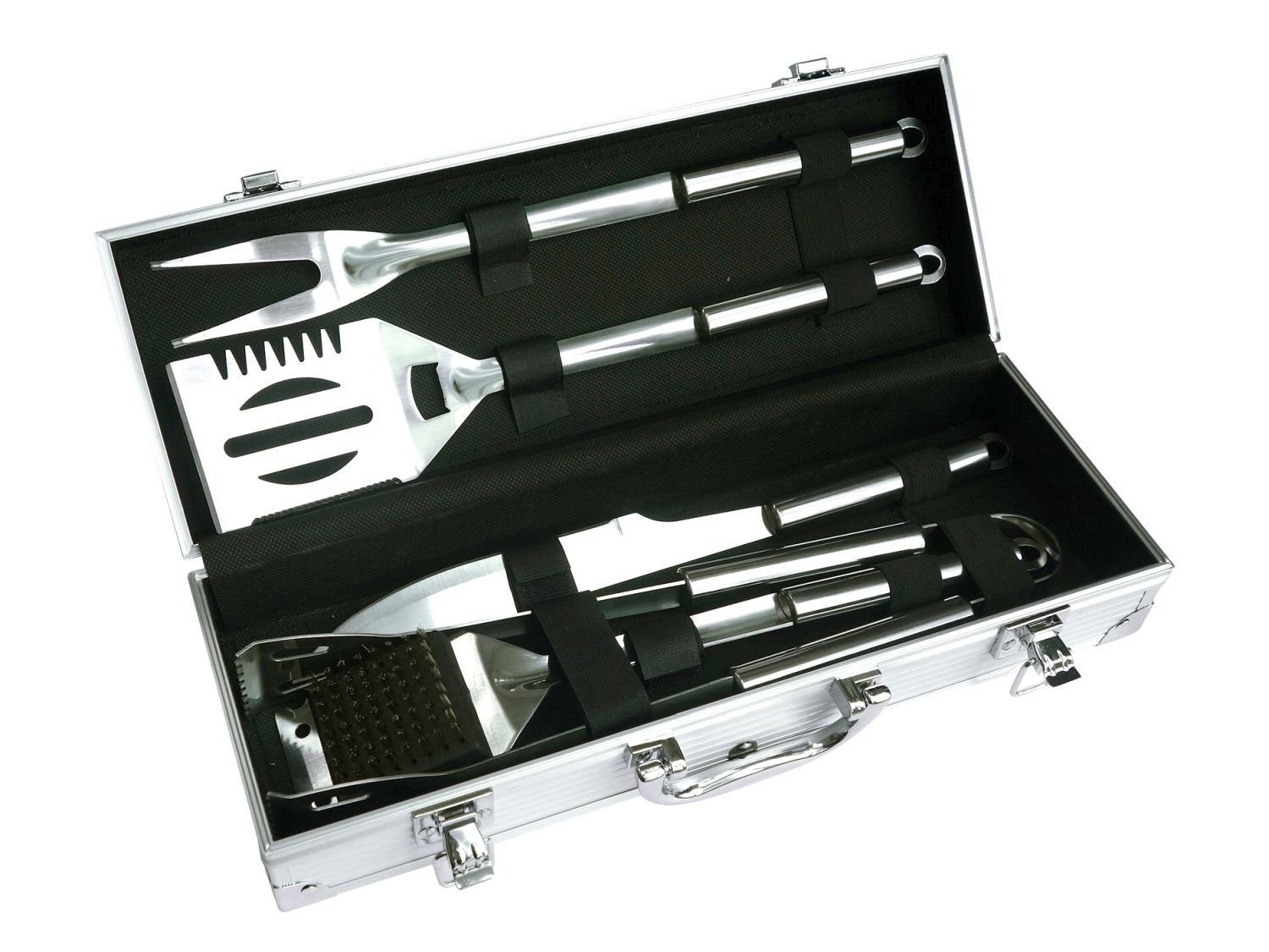 sada obsahuje: špachtle, kleště, kartáč na čištění grilu, nůž, vidlička