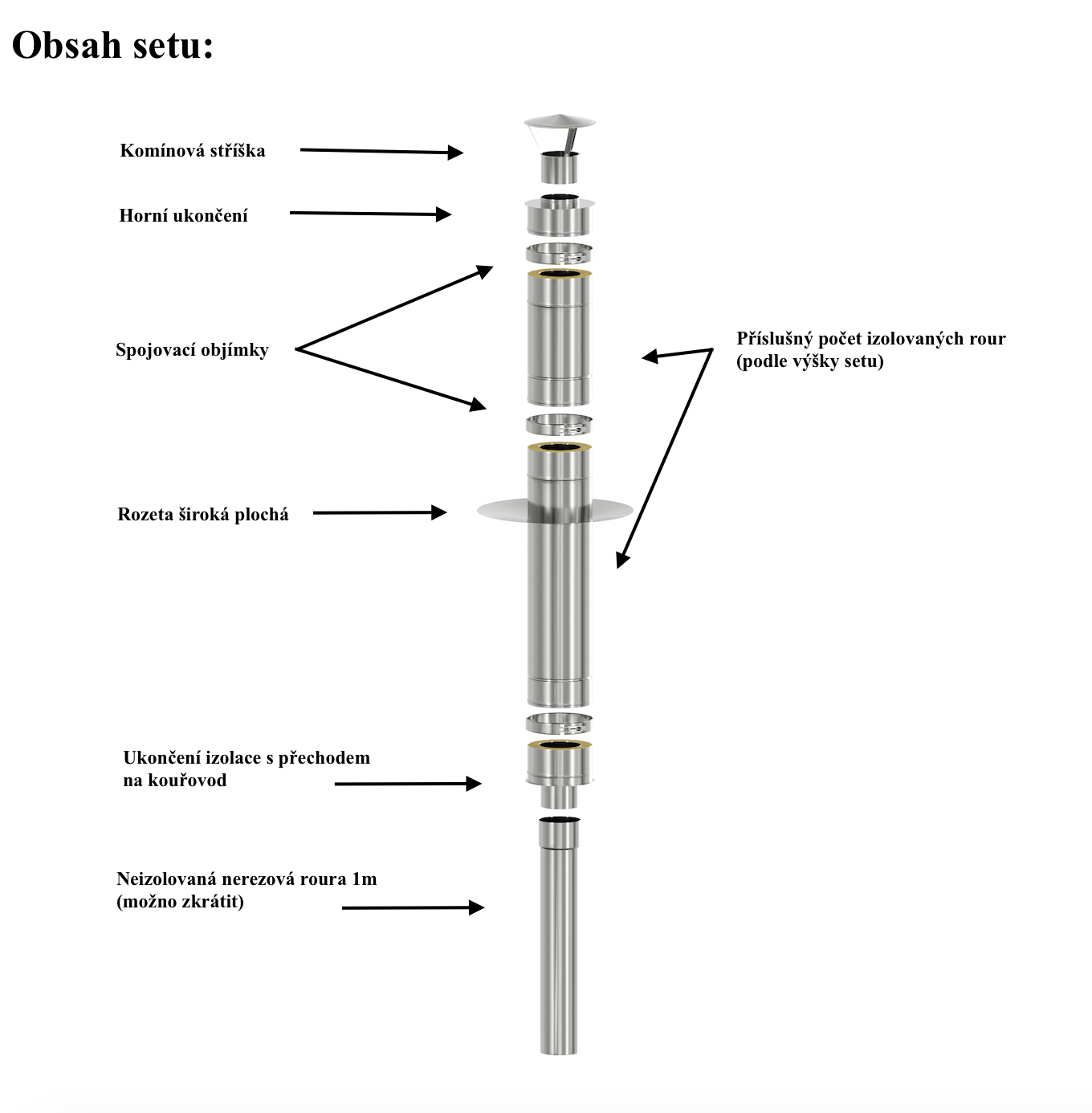Set obsahuje komponenty potřebné pro sestavení komínu o průměru 120/220 mm. Izolované komponenty jsou systém IZOL 50, který má vnitřní vložku z nerezi 1.4404 o tloušťce 0,8mm, ta je izolovaná speciální minerální vlnou tloušťky 50mm a opláštěná nerezovým plechem tloušťky 0,5mm s vysoce lesklým povrchem.