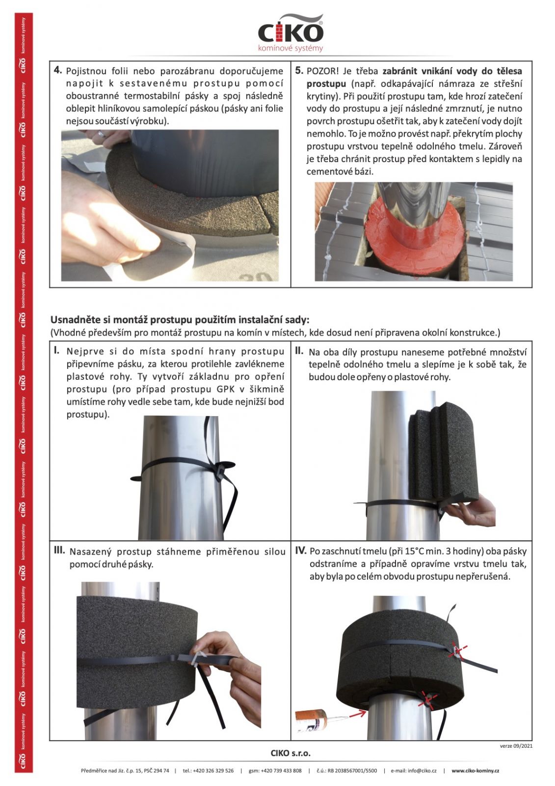 Díky parotěsnosti vlastního prostupu je možno dosáhnout parotěsnosti celého stavebního detailu. Parotěsný prostup pro nerezové komíny se standardně vyrábí v délkách 30 - 70 cm (po 10cm). Vlastní prostup lze velmi jednoduše seříznout přesně dle potřeby v místě prostupu, je tedy vhodný i pro prostupy šikmými střešními konstrukcemi.