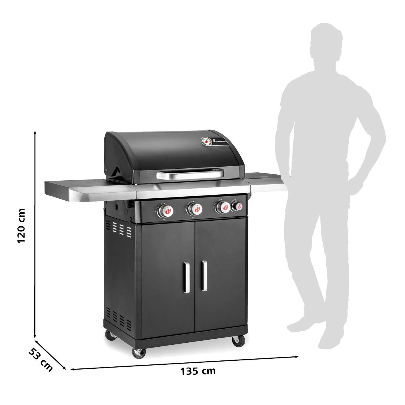 - Celkový výkon 15,0 kW zahrnuje 3 nezávislé hlavní hořáky z nerezové oceli s prodlouženou životností (každý 3,7 kW) + boční hořák na vaření (3,0 kW).