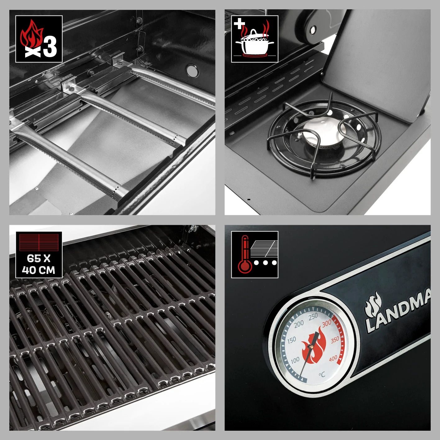 Plynový gril Landmann REXON PTS 3.1– 12273 je vynikající model velkého plynového grilu, který je vyroben kombinací ocelového lakovaného / smaltovaného plechu a broušené nerezové oceli. Je vybaven patentovaným systémem rovnoměrného vyzařování teploty PTS.