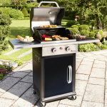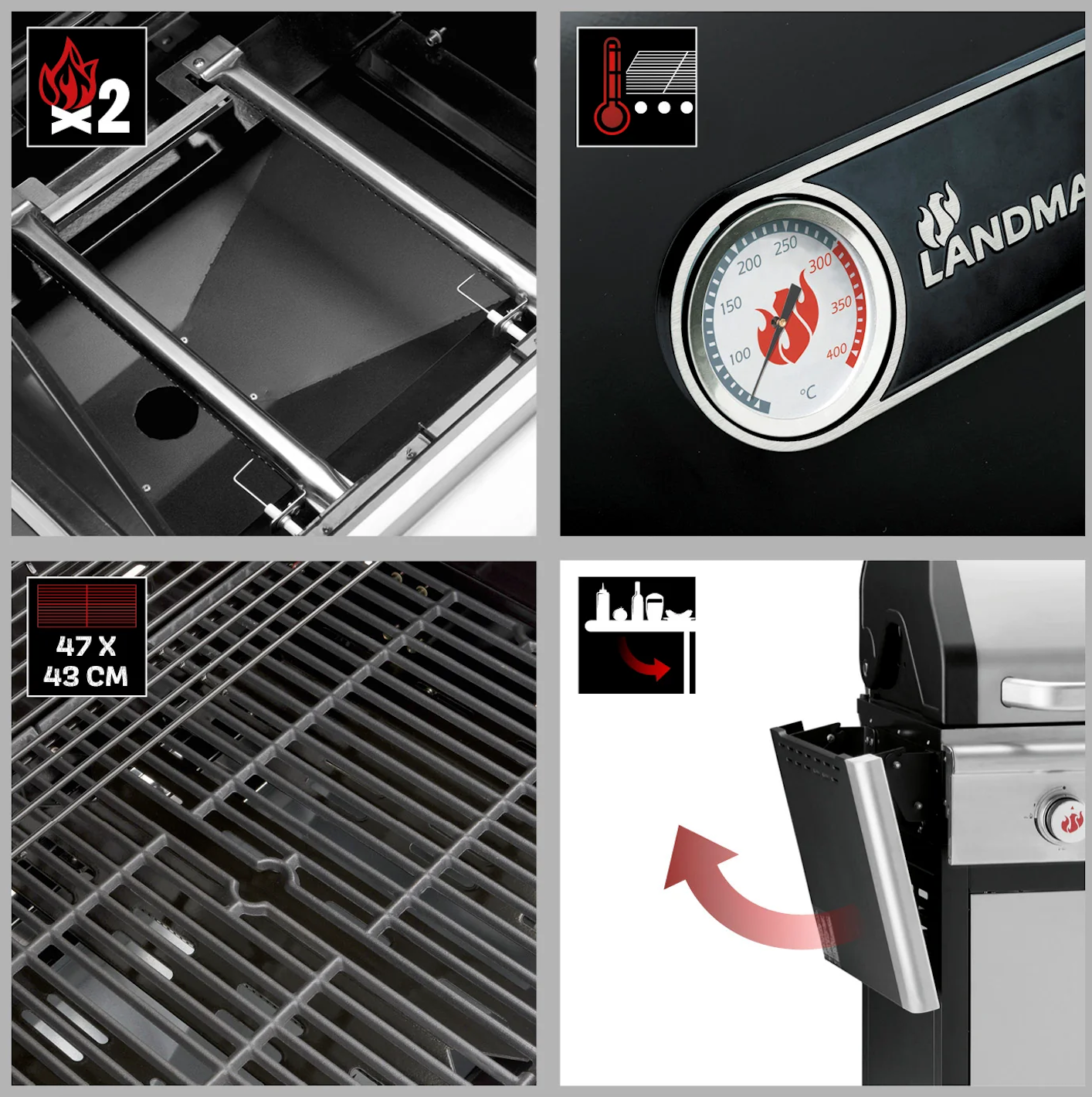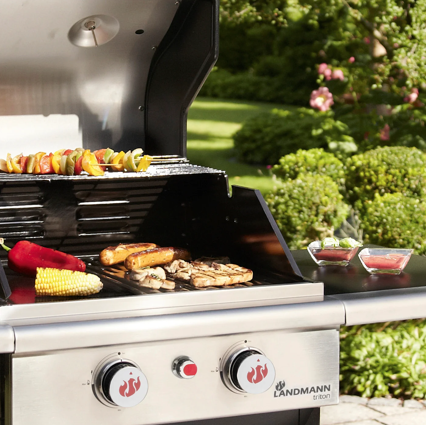 Plynový gril LANDMANN Triton je prémiový plynový gril: díky dvoustěnnému víku je teplota optimálně udržována a lze ji kontrolovat teploměrem. Plynové láhve (11 kg) a grilovací příslušenství lze uložit v uzavřené dvoustěnné spodní skříňce se dvěma dvířky. Díky čtyřem hladce se pohybujícím uzamykatelným kolečkům lze gril snadno převážet.