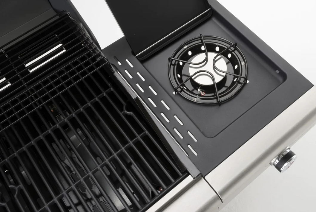 Plynový gril LANDMANN Triton je prémiový plynový gril: díky dvoustěnnému víku je teplota optimálně udržována a lze ji kontrolovat teploměrem. Tři plynule nastavitelné nerezové hořáky o jmenovitém výkonu 10,5 kW (3,5 kW na hořák) zaručují optimální přípravu grilovaných pokrmů. Systém PTS zajišťuje optimální, rovnoměrné rozložení tepla během grilování. Boční hořák (3 kW) lze použít pro další možnosti grilování: jak pro grilovací nástavce, tak pro vlastní grilovací nápady. Plynové láhve (11 kg) a grilovací příslušenství lze uložit v uzavřené dvoustěnné spodní skříňce se dvěma dvířky. Díky čtyřem hladce se pohybujícím uzamykatelným kolečkům lze gril snadno převážet.