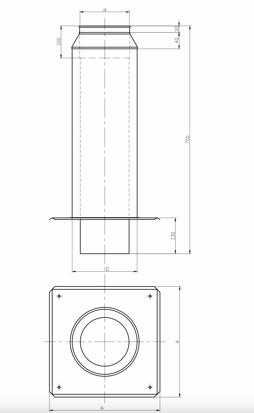 Třísložkové izolované prodloužení stávajících komínu o 0,6m v provedení nerezová vnitřní vložka - izolace a nerezový vnější plášť. Speciální izolace o síle 30mm. Vnitřní síla stěny 0,5mm, třída ušlechtilé nerez oceli 1.4301, vnější 0,5mm (1.4301 lesk). Jedná se o rychlé a elegantní řešení na nedostatečný tah komínu. Rozměr krycí desky 333x333mm.