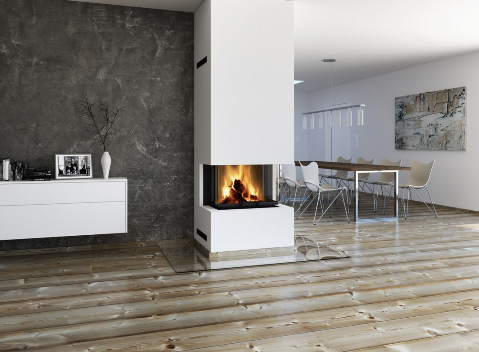Čistá pravoúhlá geometrie skla dvířek je určujícím prvkem celého designu krbových vložek HEAT s třístranným sklem a výsuvnými dvířky. Díky velkorysému prosklení si dokonale užijete hru živého ohně.