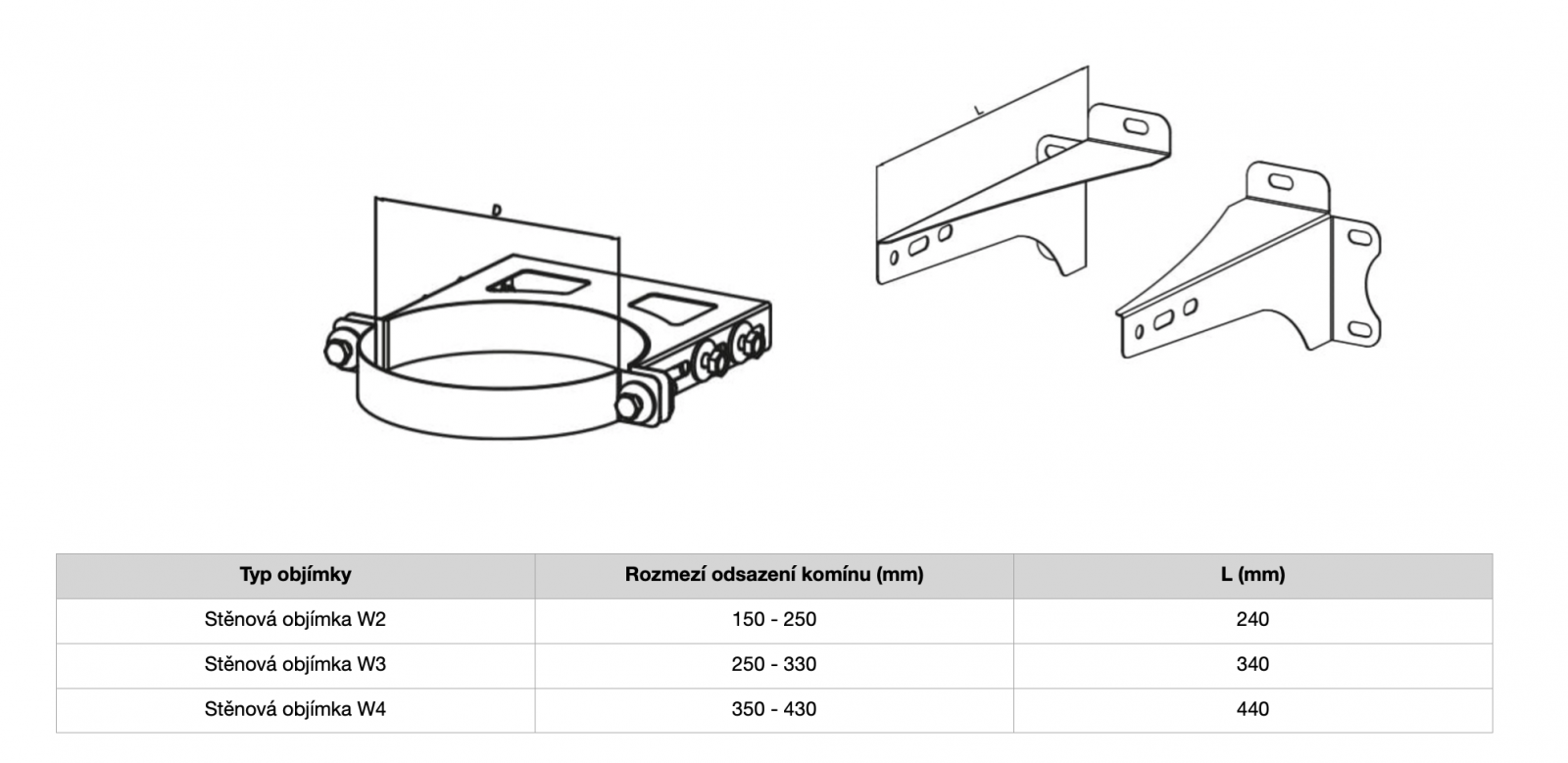 Slouží k uchycení komínového tělesa ke stěně budovy ve vzdálenosti 150 mm až 250 mm od pláště komínu, objímka je v tomto rozmezí stavitelná. Doporučujeme instalovat max. 2m od sebe. Skutečný průměr objímky odpovídá reálně 230 mm.