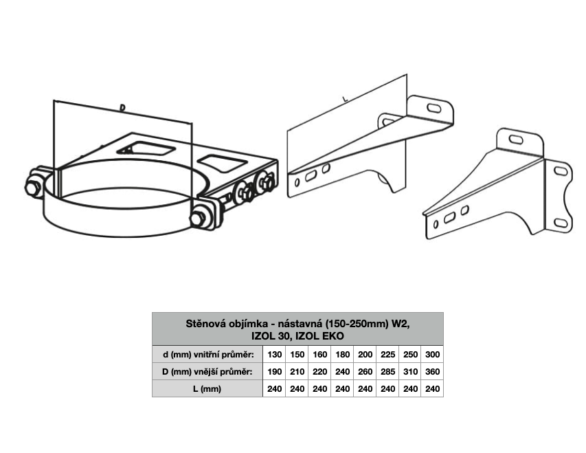 Stěnová objímka W2 (150 - 250mm) se skládá z jedné objímky na komín a dvou konzolek na stěnu.