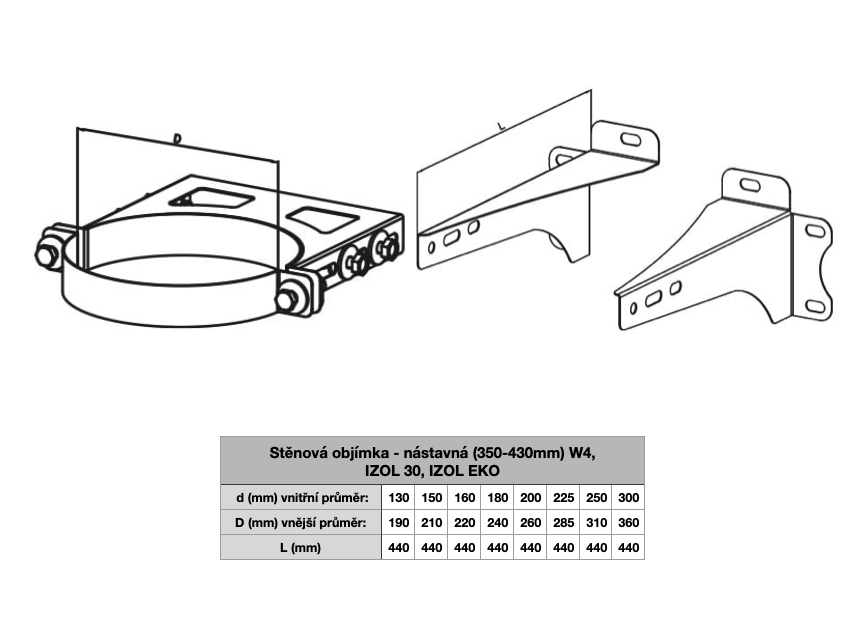 Stěnová objímka W4 (350 - 430mm) se skládá z jedné objímky na komín a dvou konzolek na stěnu.