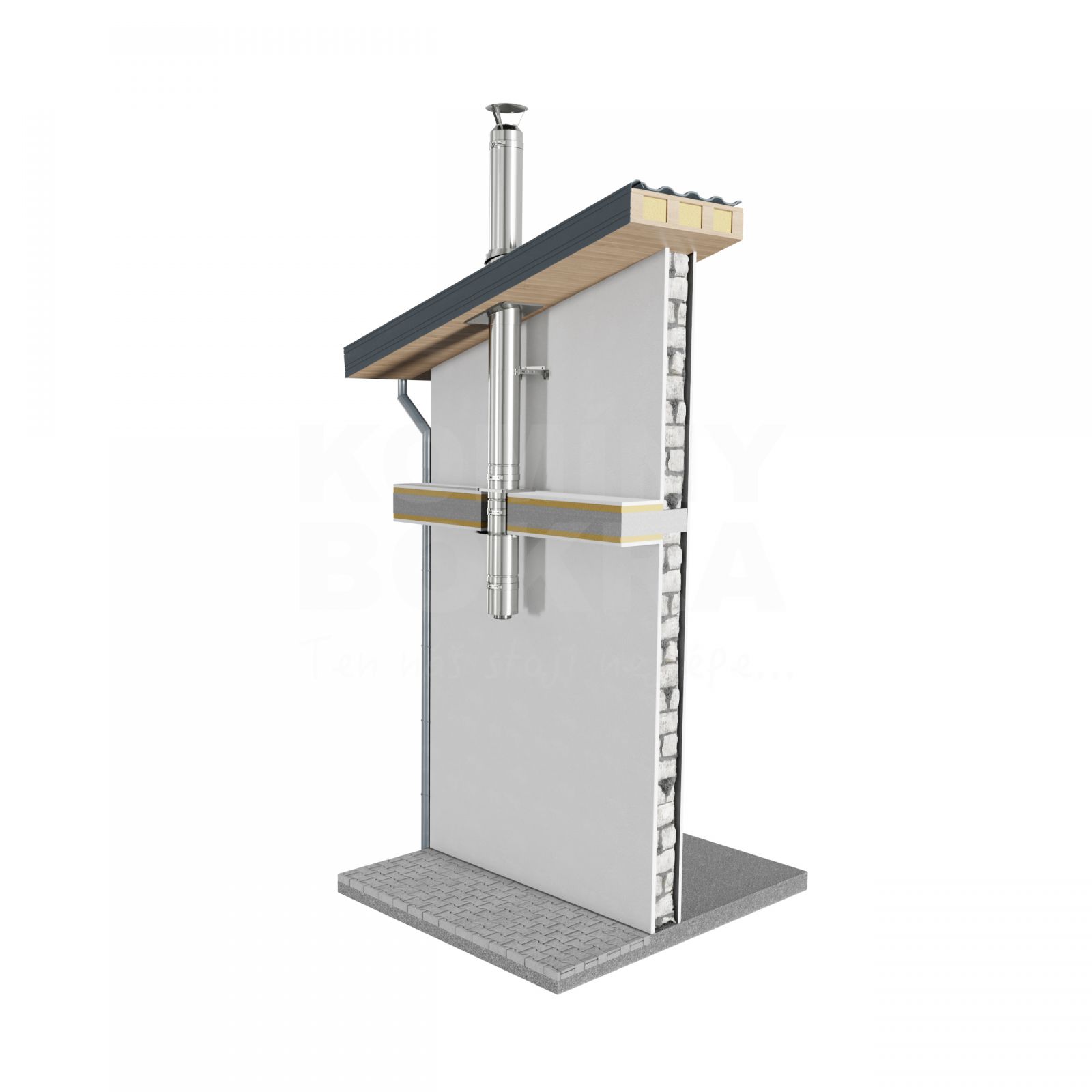Komínovou sestavu doporučujeme doplnit o vhodný střešní přechod, případně i protipožární prostup jestliže komín prostupuje hořlavými konstrukcemi. Sestava neobsahuje ocelový černý kouřovod - dopojení ke spotřebiči. V případě požadavku na jiný odstup komína od konstrukce, nebo jinou výšku Vám rádi připravíme nabídku na míru.