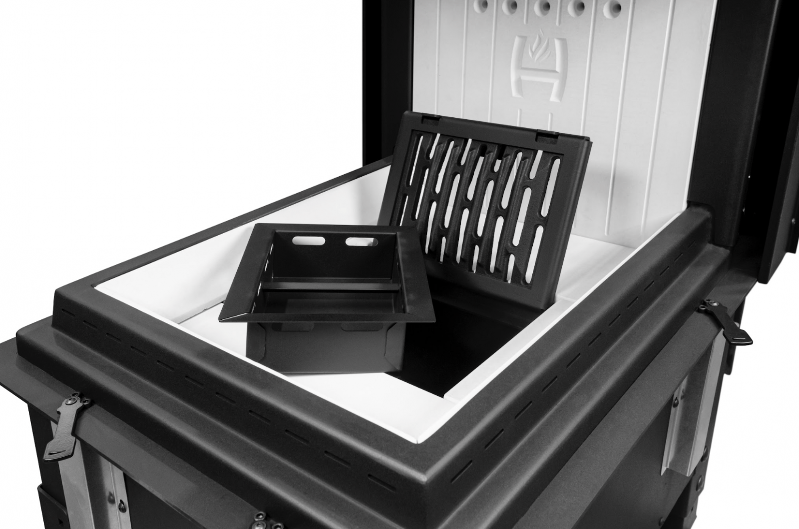 - Velká nádoba na popel v podobě vyjímatelné zásuvky pod roštem.